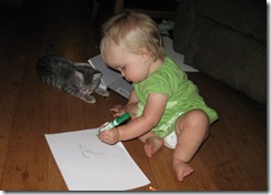 All things she regularly sees us doing. She also loves to draw, which Liberty does all the time. What cracks me up is that she almost always holds her pencil, crayon, or marker correctly! I definitely don’t remember Liberty being interested in drawing this early. She hasn’t decided which hand she prefers to draw with and switches back and forth frequently.